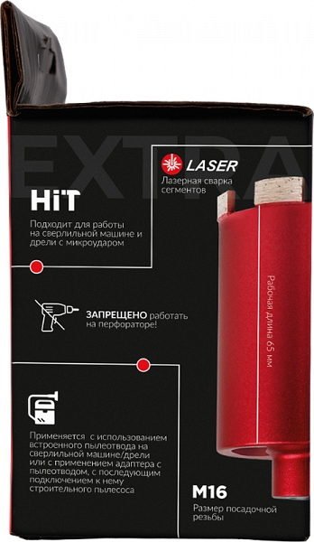 Алмазная коронка с пылеудалением для сухого сверления с микроударом подрозетников Diam Extra Line Hit 72 мм (Диам Экстра Лайн Хит 72 мм) – алмазное сегментное кольцевое сверло для подрозетников для сухого сверления бетона, железобетона (армированного бетона, арматура толщиной до 10 мм), бетонных строительных блоков, кирпича на сверлильных машинах с функцией микроудара без подачи воды. Применяется с использованием встроенного пылеотвода на сверлильной машине или с применением адаптера с пылеотводом, с последующим подключением к нему строительного пылесоса.