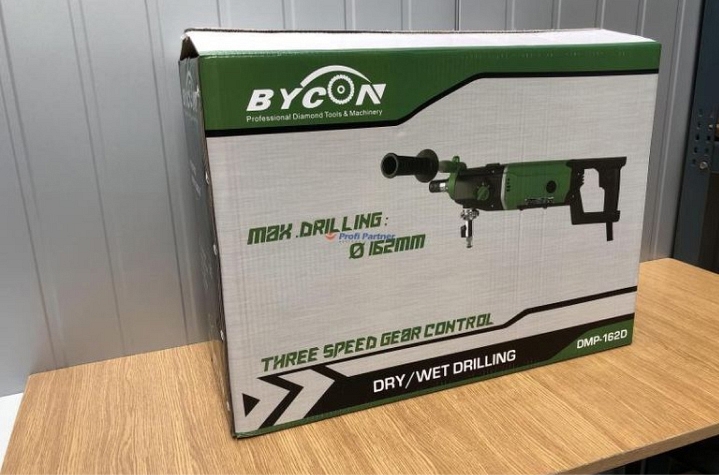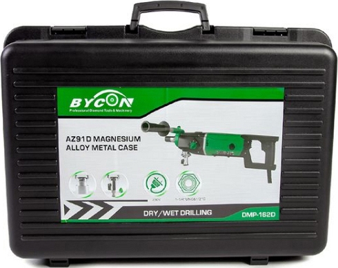 Дрель для алмазного бурения Bycon DMP-162D (Байкон ДМП-162Д) – алмазная дрель для сухого и мокрого алмазного сверления отверстий Ø 10 – 162 мм в железобетоне и Ø 10 – 202 мм в кирпиче и "легком" бетоне; как с водой, так и всухую; как с использованием станины, так и "с рук"; для профессионального использования.
