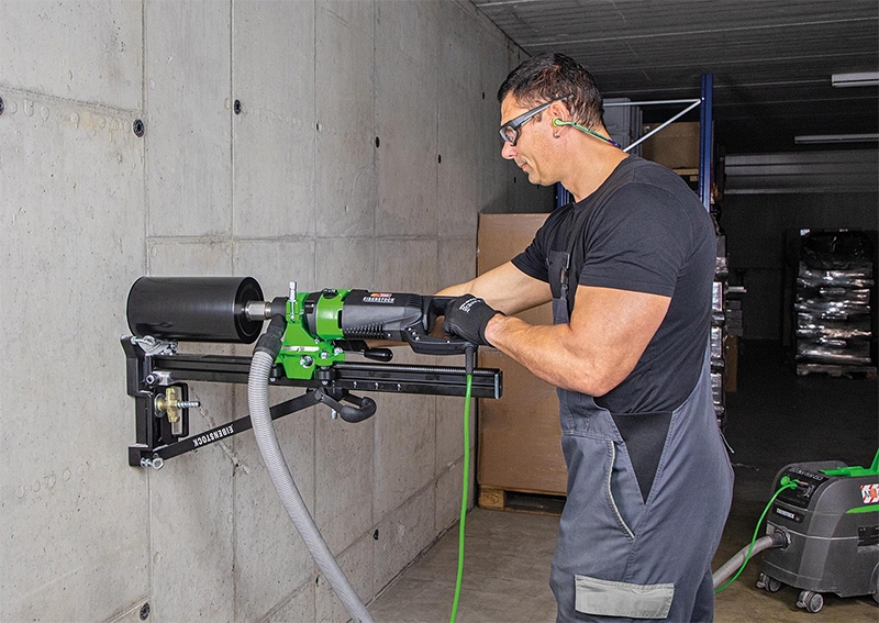 Дрель для сухого алмазного бурения с микроударом Eibenstock ESD 162 (Айбеншток ЕСД 162) предназначена для сухого сверления отверстий Ø 82 – 162 мм в особо твердых материалах, например, таких, как: железобетон; Ø 82 – 202 мм в материалах, например, таких, как: сильноуплотненный силикатный кирпич и кирпичная кладка; с высокой рабочей скоростью; идеальное решение для бурения скважин, где условия на площадке не позволяют проводить мокрое сверление (полые потолки и т. д. / предотвращение повреждения водой).