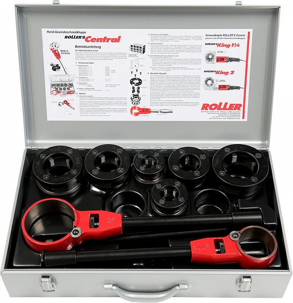 Ручной резьбонарезной трубный клупп Roller Central Set R 3/8"-1/2"-3/4"-1"-1 1/4"-1 1/2"-2" (Роллер Централ Сет Р 3/8"-1/2"-3/4"-1"-1 1/4"-1 1/2"-2") предназначен для нарезки правой конической трубной резьбы R, согласно ISO 7-1, EN 10226 (DIN 2999, BSPT), на стальных трубах Ø 3/8", 1/2", 3/4", 1", 1 1/4", 1 1/2", 2".